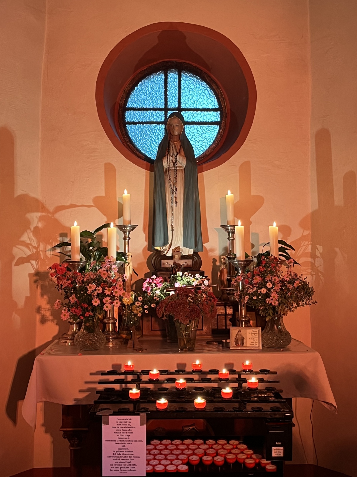 Heute nun hatte der PGR die Marienfigur mit Kerzen und Strahlern in Szene gesetzt. Trotz des widrigen Wetters fanden gut 20 Gläubige den Weg in die Kapelle. Die eingängigen Gebete und der Gesang von bekannten Marienliedern füllten den kleinen Raum, sodass beides viel besser zur Geltung kam, als in der großen Pfarrkirche.