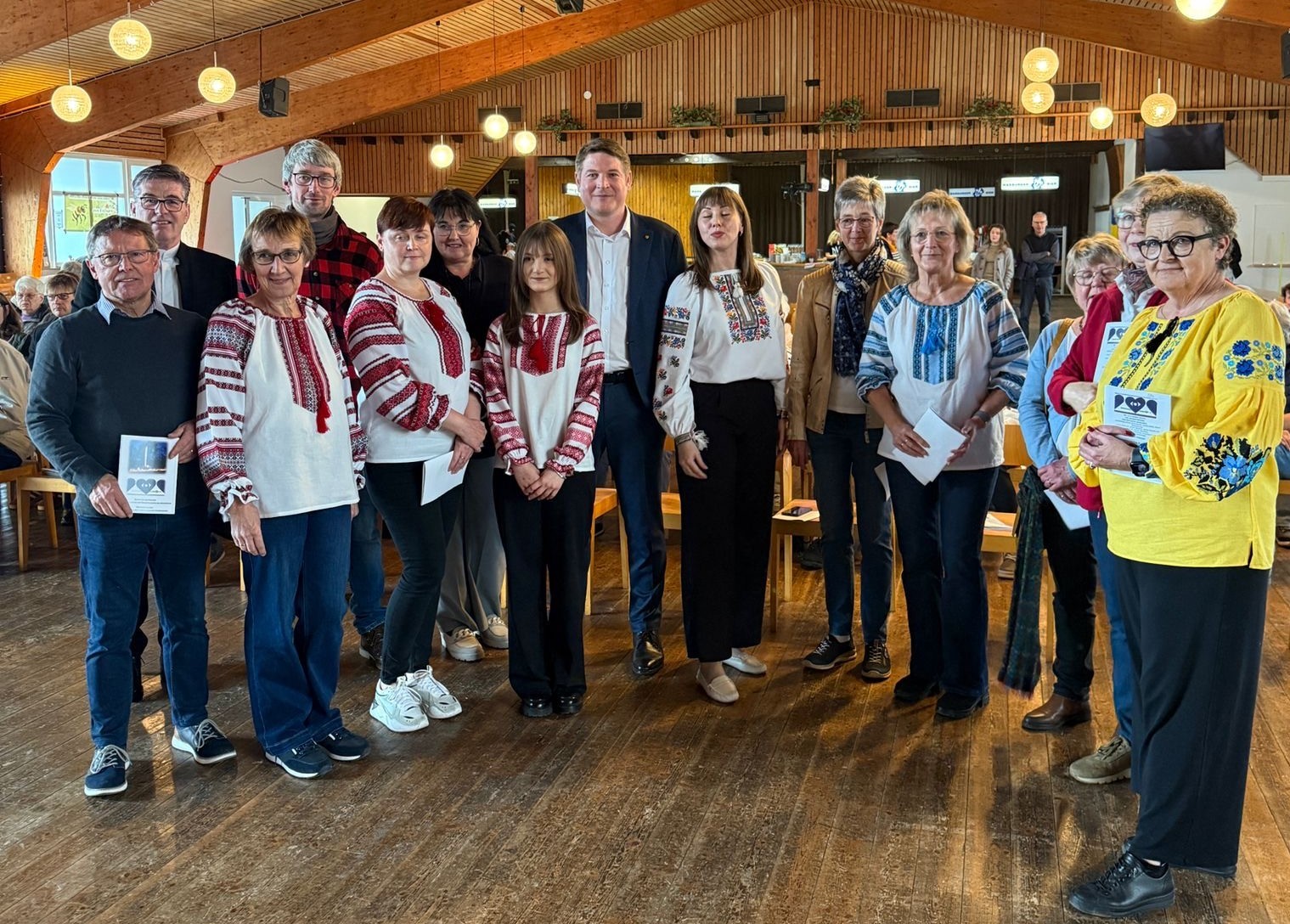 Doch beim Tag der Begegnung gab es in diesem Jahr etwas Besonderes; ein gemeinsames Gebet für den Frieden mit den Freunden in der Ukraine. Mit einer Live-Schaltung waren die Gläubigen in der Borgentreicher Schützenhalle mit der Kirche in Brody/Ukraine verbunden und konnten gemeinsam singen und beten.