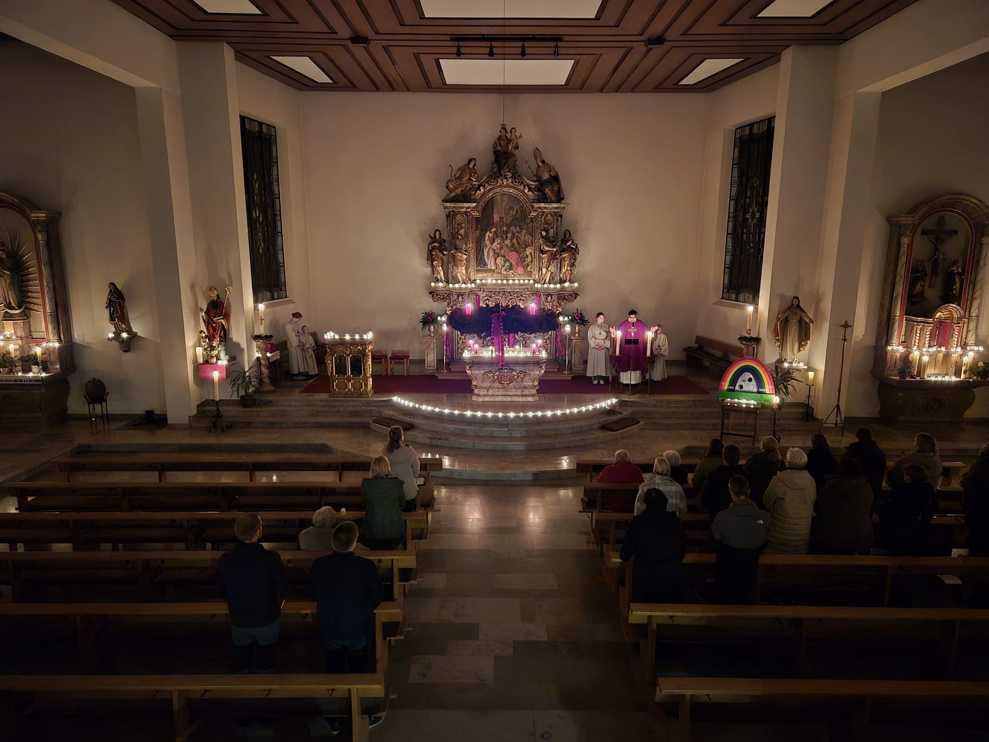 Am vergangenen Dienstag, 9.12. fand in der St. Nikolaus-Kirche in Natzungen eine stimmungsvolle Roratemesse statt. Der Kirchenraum wurde dabei nur durch Kerzen erleuchtet. In dieser dunklen Jahreszeit traf dieses Angebot offensichtlich den Nerv der Gläubigen, denn ca. 40 Gemeindemitglieder nahmen an dem Gottesdienst teil, was für einen normalen Wochentag eine beachtliche Zahl ist.