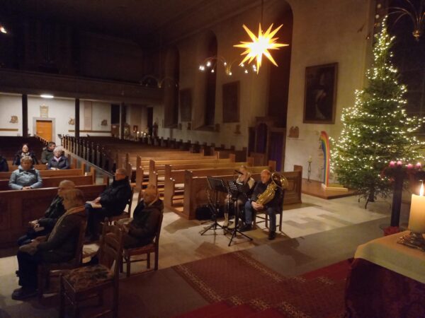 Zwischen den Jahren hatte der Pfarrgemeinderat St. Vitus Bühne zum Singen von Weihnachtsliedern eingeladen. Erfahrungsgemäß wird das gemeinsame Singen in den Familien kaum noch praktiziert. Daher sollte mit dieser Einladung die Freude am gemeinsamen Singen wieder entfacht werden, denn noch mehr Spaß macht es natürlich mit musikalischer Begleitung. Michael Hengst und seine Tochter Franziska, die dem Musikverein Bühne angehören, haben die musikalische Begleitung mit ihren Blasinstrumenten übernommen. Ganz nah an der Krippe mit Kerzenscheinbeleuchtung konnte jeder dabei in weihnachtliche Stimmung eintauchen.